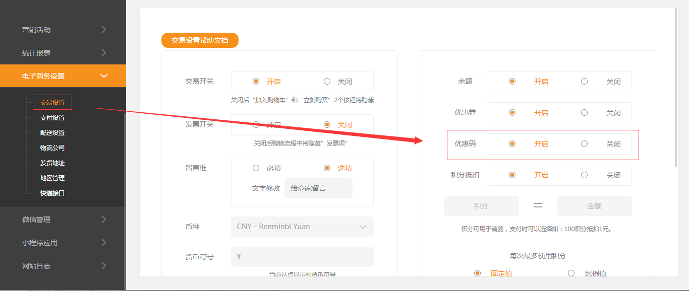 建站新增了优惠码功能,可以在后台设置并发送给用户使用,下单时抵扣一定金额。默认优惠码开启,可在建站后台-“电子商务设置”-“交易设置”中设置,如图所示  :